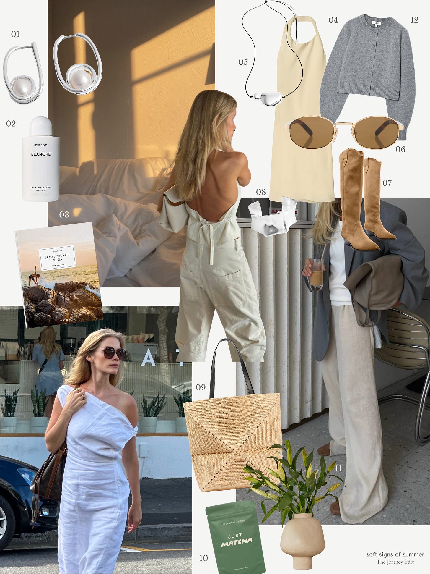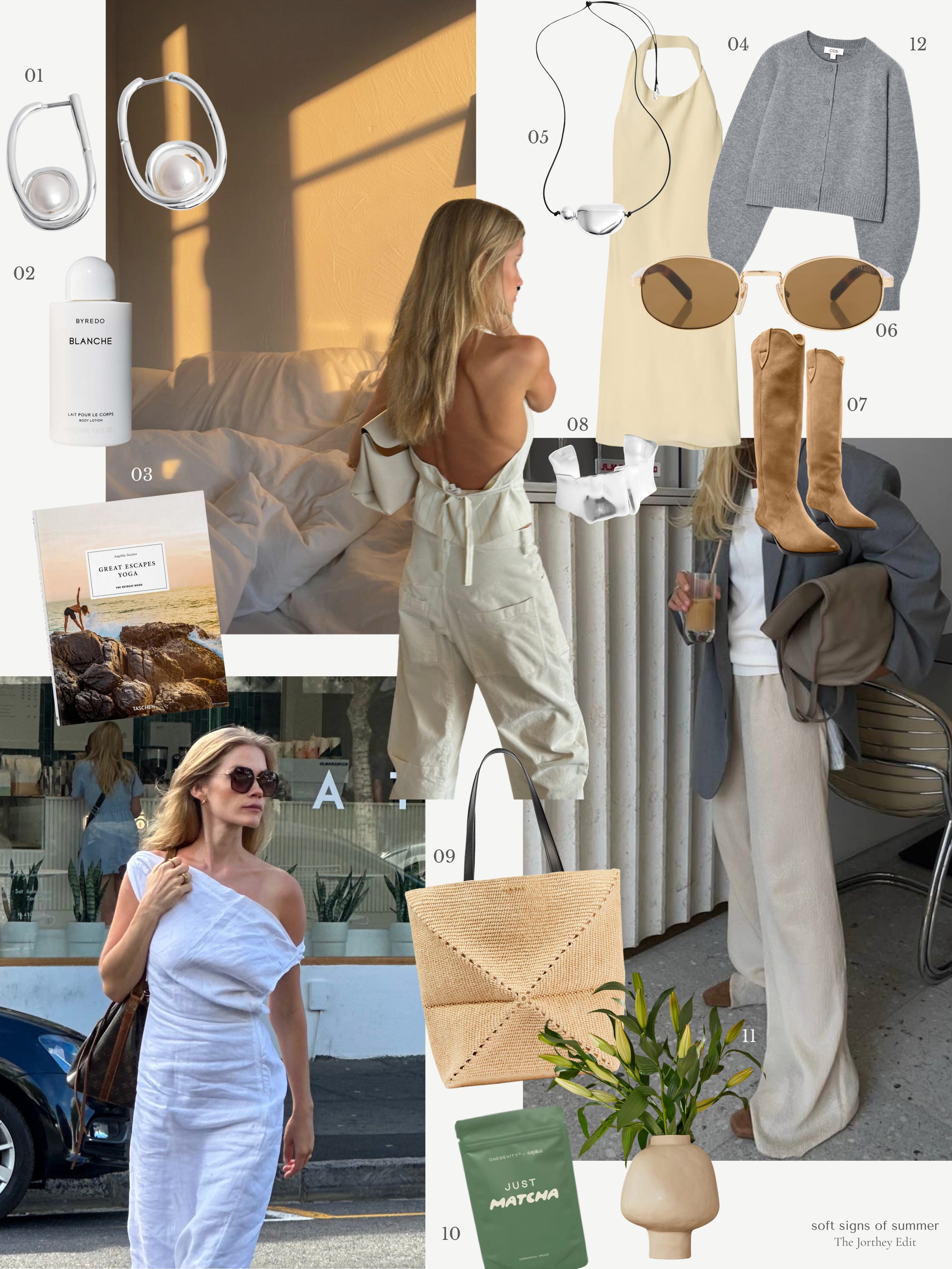 01 — pearl drop earrings 02 — body lotion ‘blanche’ 03 — coffee table book ‘great escapes yoga’ 04 — halterneck dress 05 — pendant necklace 06 — vintage -style sunglasses 07 — suede knee-high boots 08 — chunky silver cuff 09 — straw tote 10 — just matcha 11 — sculptural vase 12 — cropped knit